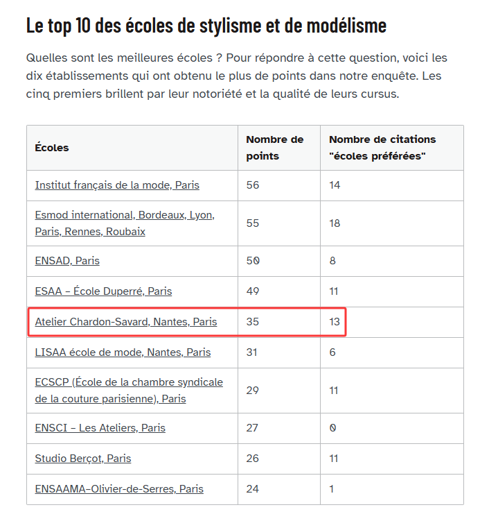在法国权威教育杂志《L’etudiant》的排名中,IFM常年位居法国第1,法国莎东服装学院也稳居法国第5。两所学校均被公认为法国时装教育的第一梯队,教学质量与行业声誉俱佳。